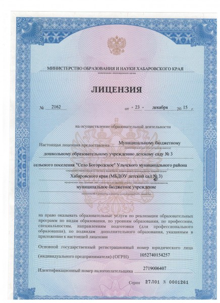 | Полное наименование образовательной организации* | Муниципальное бюджетное дошкольное учреждение детский сад №3 сельского поселения «Село Богородское» Ульчского муниципального района Хабаровского края |